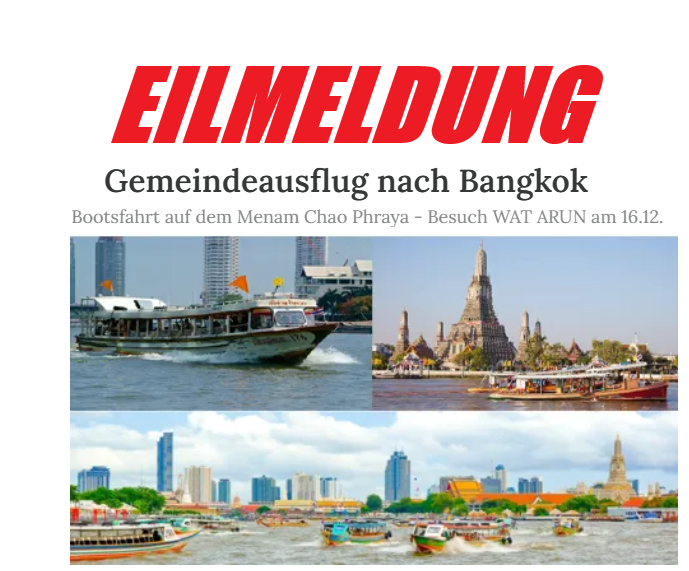 Eigentlich ist der Gemeindeausflug nach Bangkok - wie immer - sehr schnell ausgebucht. Da wir aber noch weitere Interessenten haben, werden wir uns um einen weiteren Minivan bemühen, für dessen Belegung es Stand heute aber noch weiterer sieben Anmeldungen bedarf. Sollte dieses zusätzliche Kontingent nicht zustande kommen, erhalten alle ihren zuvor hinterlegten Unkostenbeitrag zurück und haben dann die Möglichkeit, an zwei weiteren Gemeindeausflügen im Januar und Februar 2026 teilzunehmen. Es besteht zudem die Möglichkeit, den Teilnahmebeitrag auch per Überweisung zu leisten.