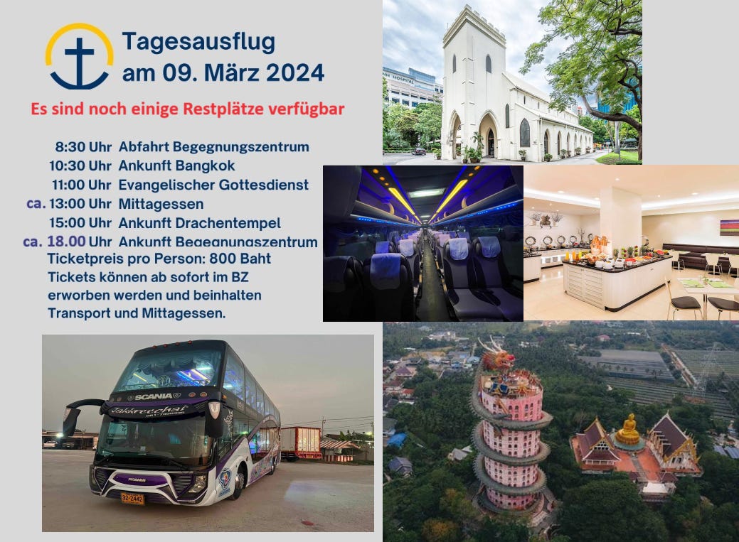 Last Call: Tagesausflug nach Bangkok09.03.2024 Gottesdienst, Mittagsbuffet und Besuch des DrachentempelsBZ PattayaMärz 08, 2024TeilenZurückWeiter
