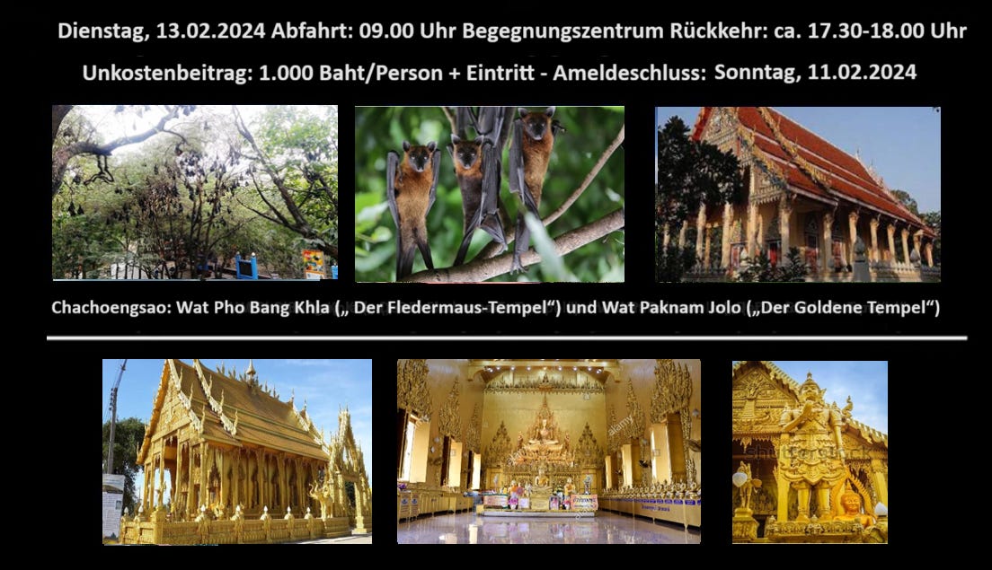 13.02.2024 Chachoengsao: Wat Pho Bang Khla („ Der Fledermaus-Tempel“) und Wat Paknam Jolo („Der Goldene Tempel“)