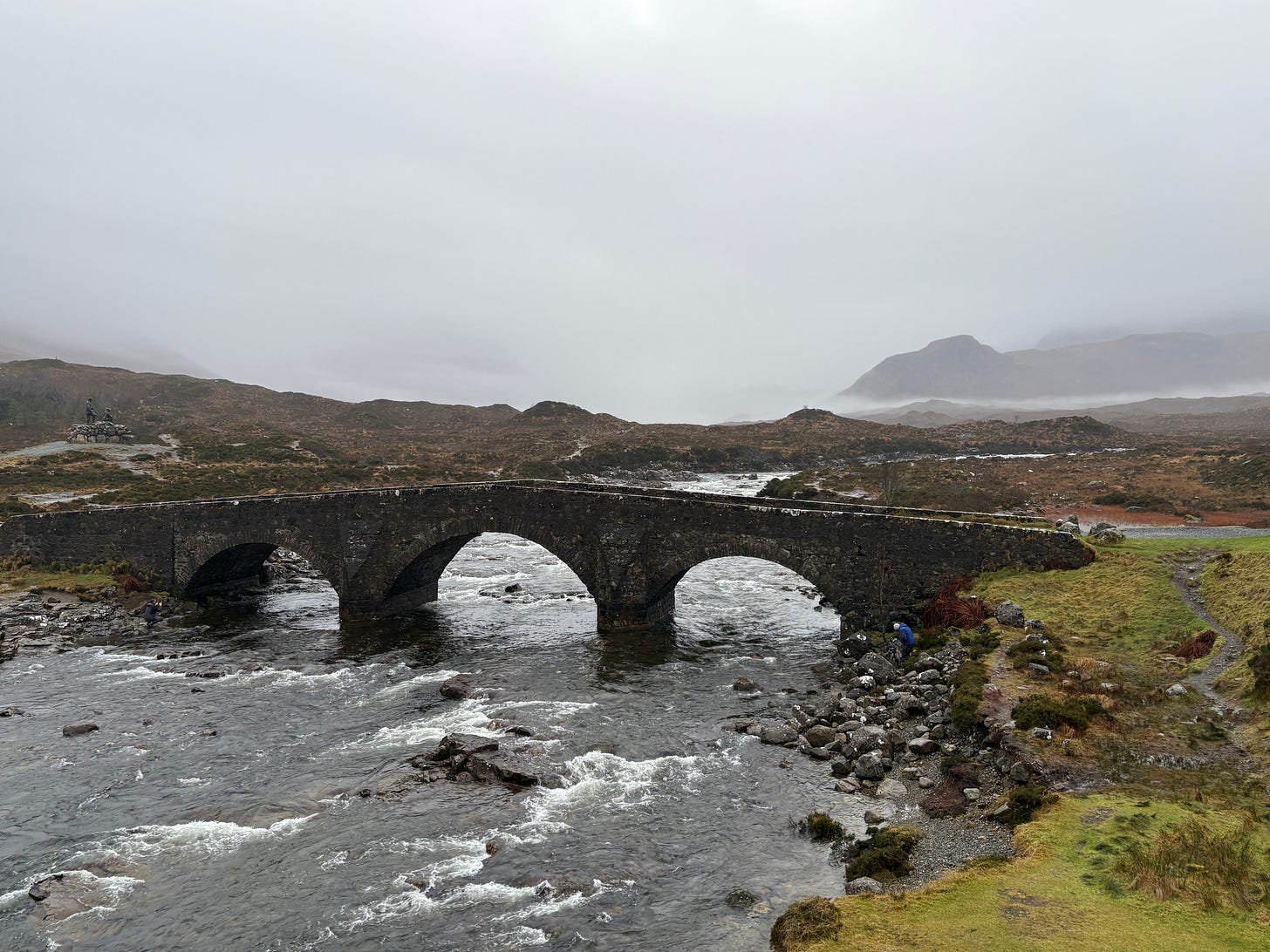 Obiges Bild von Florian Booneiam zeigt eine historische Steinbrücke in den schottischen Highlands mit drei markanten Rundbögen, die sich über einen unruhigen Fluss spannt. Das Wasser fliesst mit schäumender Kraft zwischen grossen Steinen hindurch, während sich an den Ufern Geröll und Moos sammelt. Die Brücke selbst wirkt robust und dunkel, als hätte sie schon viele Jahrhunderte Wind und Wetter getrotzt. Rechts führt ein schmaler Pfad durch eine grüne Wiese zum Flussufer, wo man einzelne Felsen und Büsche erkennen kann. Die Landschaft dahinter ist weit und karg, in erdigen Braun- und Grüntönen gehalten. Teilweise verschwinden im Nebel sanft ansteigende Hügel und ferne Berge, wodurch die Szene eine geheimnisvolle, fast mystische Stimmung erhält. Das Bild vermittelt Ruhe, Naturkraft und den Eindruck einer zeitlosen, wilden Landschaft.