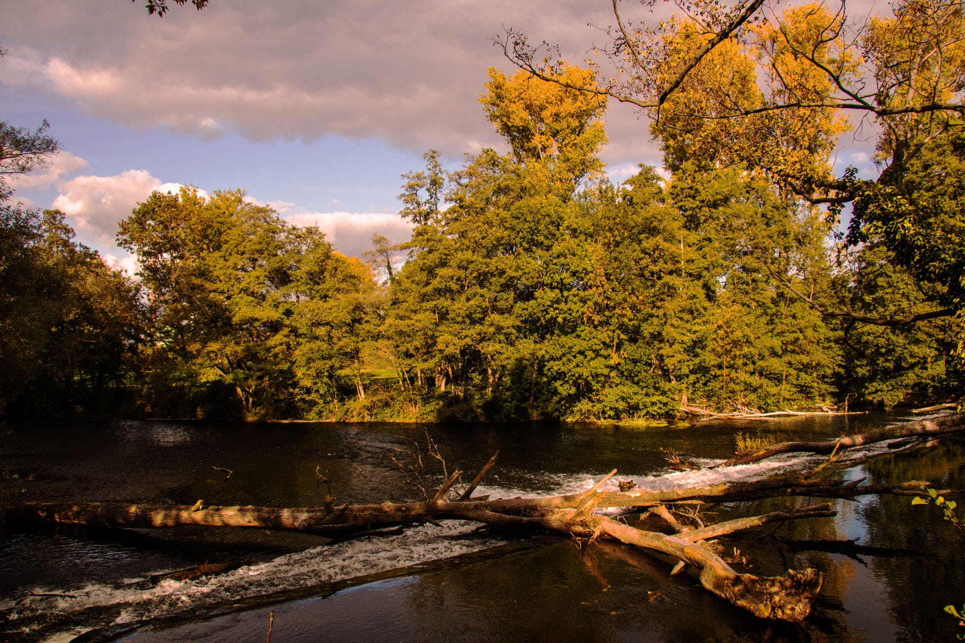 Das Bild zeigt eine herbstliche Flusslandschaft. Im Vordergrund fliesst ein breiter, dunkler Fluss, über den mehrere umgestürzte Baumstämme liegen. Am Ufer erhebt sich ein dichter Wald, dessen Bäume sich in warmen Herbstfarben verfärben – leuchtendes Gelb, Orange und sattes Grün mischen sich miteinander. Die Abendsonne taucht die Szenerie in goldenes Licht und verleiht den Blättern einen warmen Schimmer. Am Himmel hängen grosse, teils dunkle Wolken, die jedoch durch helle Flecken blauen Himmels aufgelockert werden. Die Stimmung wirkt ruhig und zugleich lebendig – ein Moment, der die Schönheit des Herbstes in der Natur einfängt.