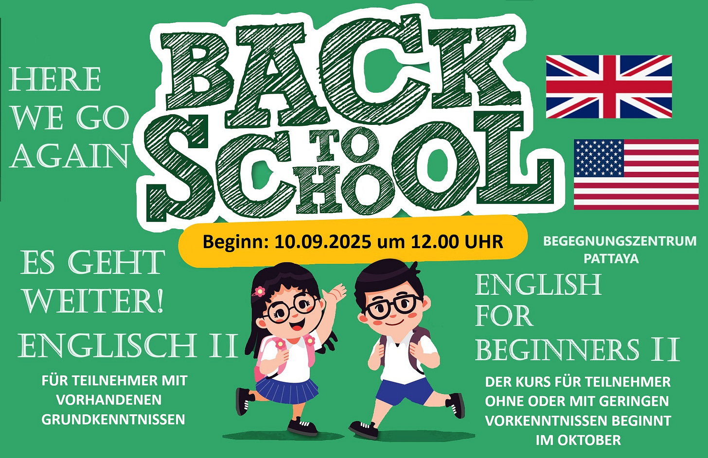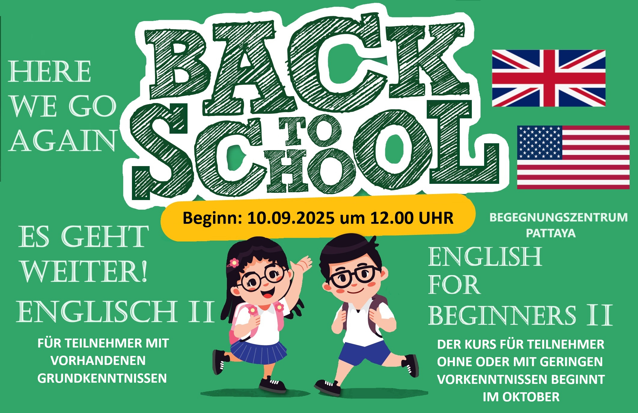 13:00 bis 14:00 ▪ Laufender Anfängerkurs, Lautschrift/Sprechen, 1. Stock,
