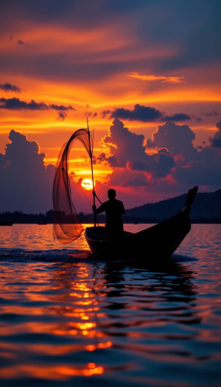 Auf dem Bild sehen wir eine eindrucksvolle Szene bei Sonnenuntergang . Im Vordergrund befindet sich ein Fischer in einem schmalen Boot, der ein grosses Netz auswirft. Seine Silhouette hebt sich dunkel vom leuchtenden Himmel ab.