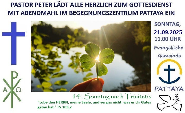 Immer wieder das Gleiche: Wenn es mir schlecht geht, dann vergesse ich zu gerne, wie viel mir schon in meinem Leben geschenkt wurde. Geht es mir aber wieder gut, dann kommt mir das selbstverständlich vor. Der 14. Sonntag nach Trinitatis hilft dem Gedächtnis auf die Sprünge und öffnet die Augen für den, von dem all das Gute kommt. Wer dankbar auf sein Leben blickt, der ist nicht nur glücklicher, der lebt auch in Gottes Geist. Dieser Geist weckt auch die Erinnerungen an die Wohltaten, die wir empfangen haben. Der Sonntag erzählt Geschichten von Menschen, die von Gott beschenkt werden. Sie alle erfahren: Sie können nicht mehr so weiterleben wie bisher. Dankbarkeit hat verändernde Kraft - Reden wir mal drüber, gerne auch bei einer Tasse Kaffee nach dem Gottesdienst. Wir freuen uns auf euren Besuch.