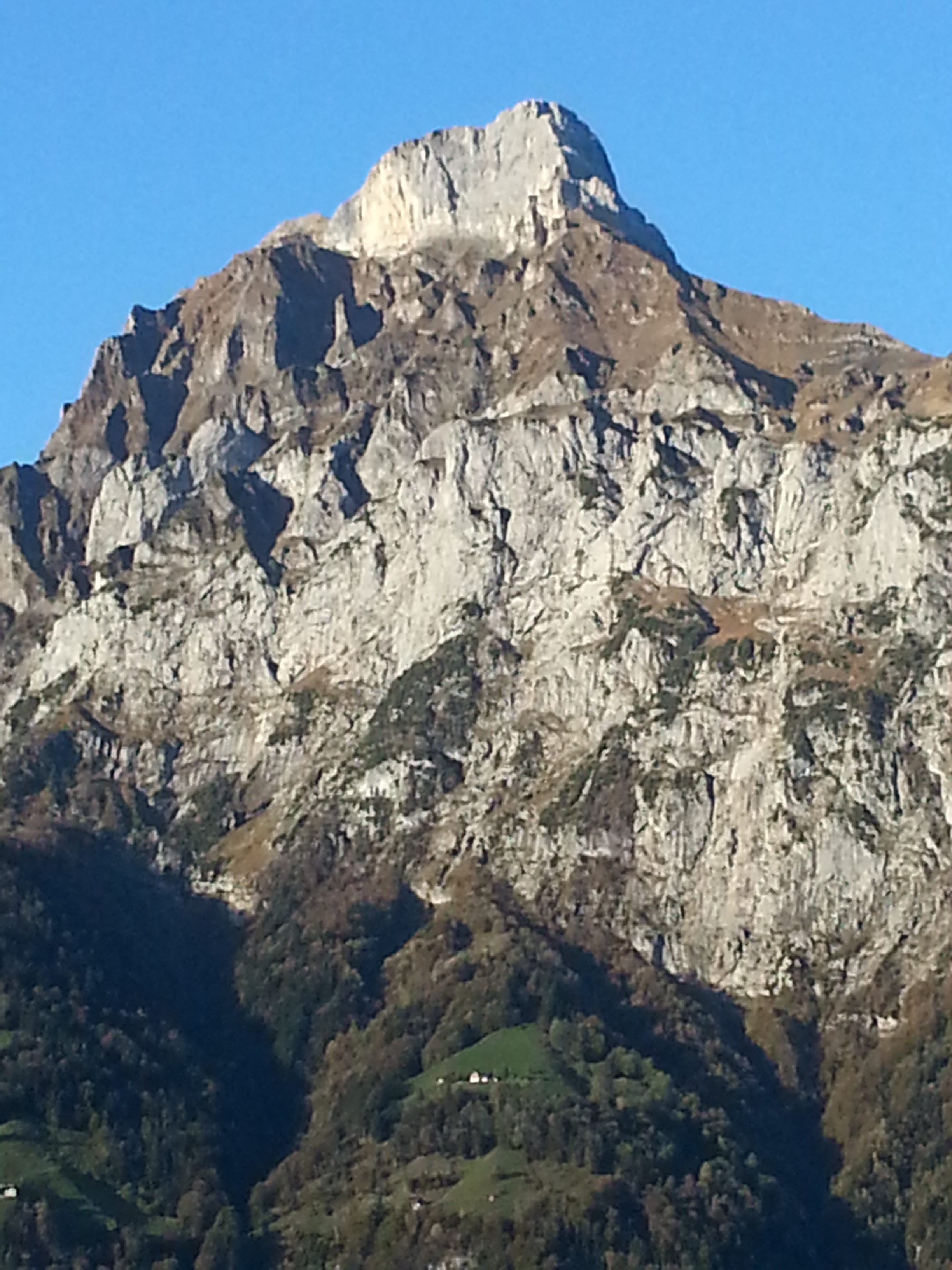 Das Bild zeigt einen markanten, felsigen Berg bei klarem, sonnigem Wetter. Der obere Teil des Berges besteht aus hellgrauem bis weisslichem Fels und hebt sich deutlich vom tiefblauen Himmel ab. Der Gipfel wirkt massig und abgerundet, fast kuppelförmig, und besteht überwiegend aus nacktem Fels ohne Vegetation. Die Flanken des Berges sind steil und durchzogen mit zahlreichen Schluchten und Felsformationen.