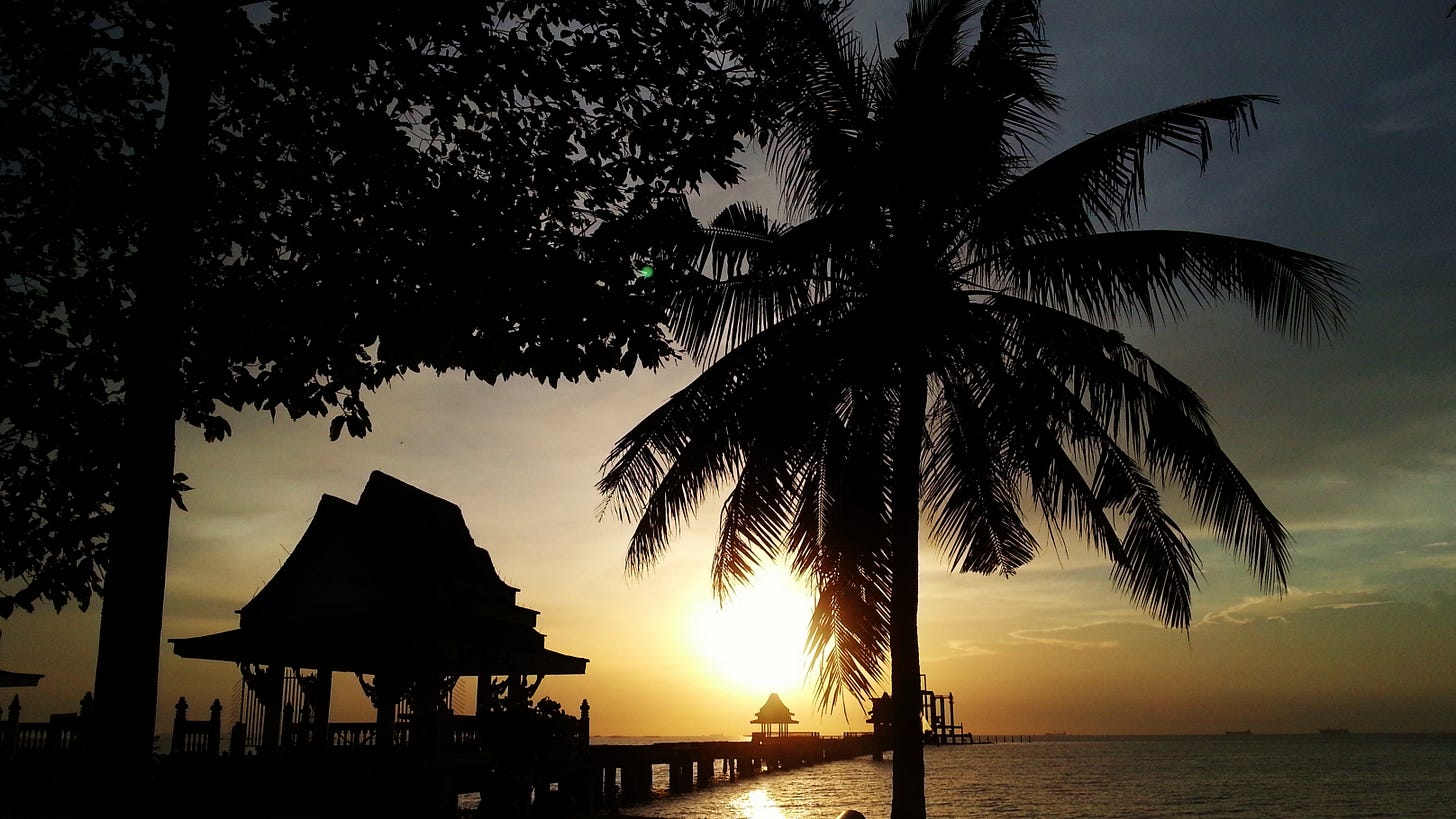 Die Aufnahme fängt den magischen Moment eines Sonnenuntergangs am Meer ein. Die goldene Sonne sinkt langsam dem Horizont entgegen und wirft ein warmes, sanftes Licht über die Szene. Ihre Strahlen durchbrechen die zarten Palmwedel einer grossen Palme im Vordergrund, die gemeinsam mit weiteren Bäumen eine eindrucksvolle Silhouette bildet.