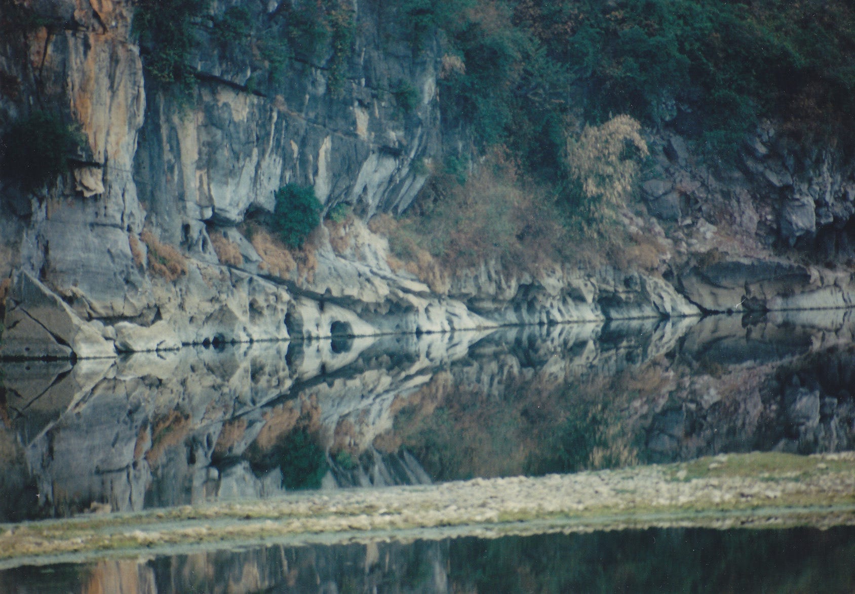 Die winterliche Landschaft wirkt still und zurückgezogen. Die steile Felswand erhebt sich kühl und grau über dem Fluss, stellenweise von dunklem Grün unterbrochen, das der Kälte trotzt. Das Wasser liegt ruhig da, glatt wie Glas, und spiegelt die Felsen in klarer, beinahe strenger Symmetrie. Am Rand des Wassers sammeln sich helle Ablagerungen, als lägen erste Spuren von Reif oder gefrorenem Gras. Die Szene strahlt eine tiefe Ruhe aus – eine winterliche Einkehr, in der die Natur schweigt und Kraft sammelt.