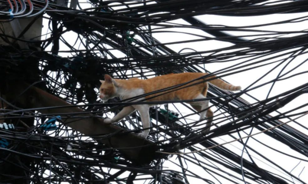 Das Foto zeigt eine schlanke, orange-weisse Strassenkatze, die sich in schwindelerregender Höhe durch ein chaotisches Netz aus Kabeln bewegt. Die zahlreichen Leitungen sind wild ineinander verknäuelt und hängen unordentlich über und unter ihr – ein typisches Bild irgendwo in unserer Gegend. Die Katze wirkt konzentriert und geschmeidig, als würde sie einen Balanceakt vollführen. Durch das helle, fast weisse Licht im Hintergrund heben sich sowohl die dunklen Kabel als auch die Katze klar ab, wodurch die Szene fast wundersam wirkt. Es entsteht der Eindruck, als würde sie durch ein Wirrwarr aus Linien schwebend ihren eigenen Weg suchen.