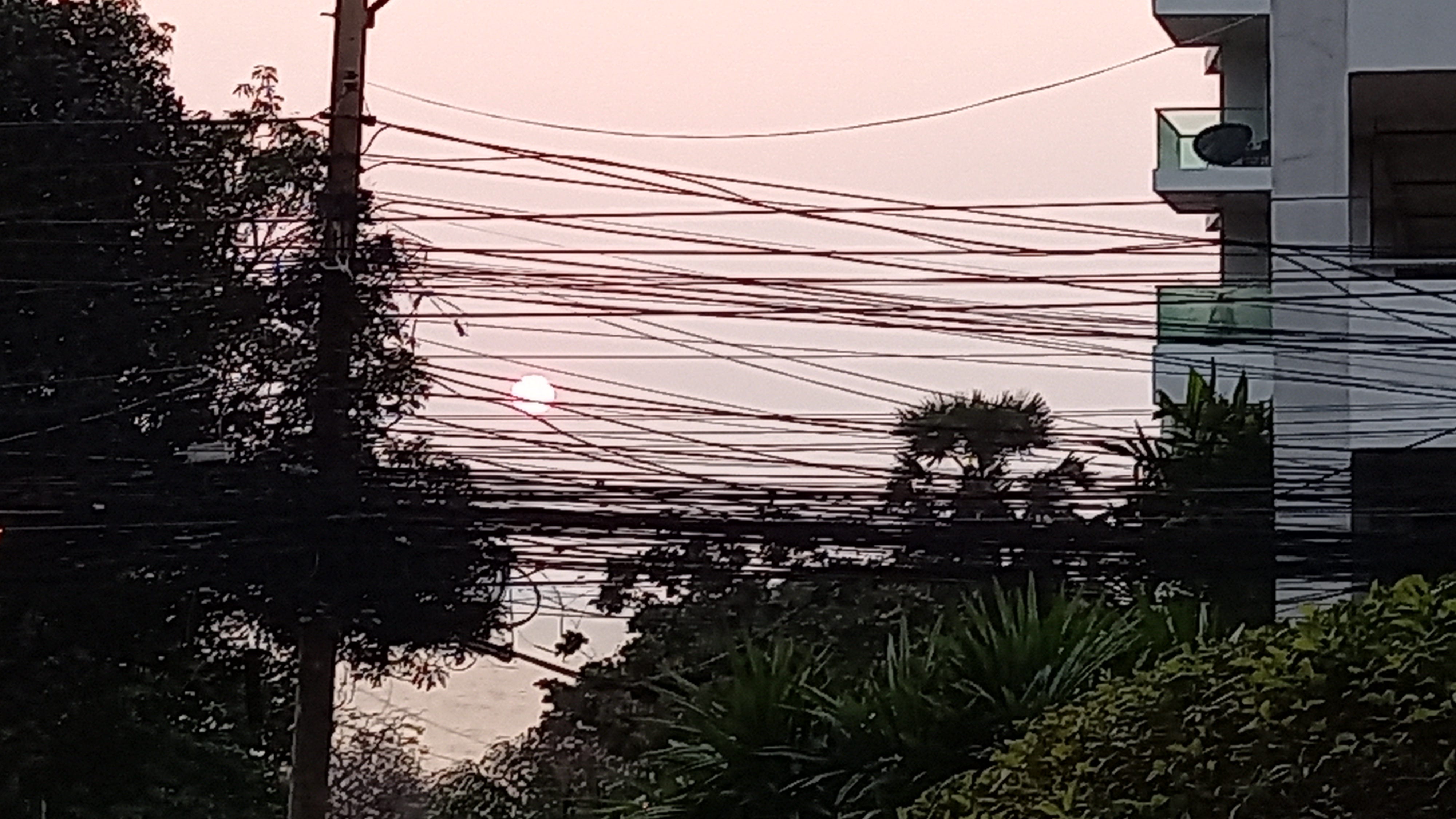 Im Vordergrund dominieren dunkle Silhouetten von Bäumen und tropischer Vegetation – darunter fächerartige Palmen und buschige Sträucher. Links erhebt sich ein Strommast, von dem zahlreiche elektrische Leitungen quer über das gesamte Bild gespannt sind und die das Motiv wie ein feines, dichtes Netz durchziehen. Rechts ist ein Teil eines modernen Gebäudes mit Balkonen und hellen Fassadenflächen zu sehen, das teilweise den natürlichen Blick einrahmt.