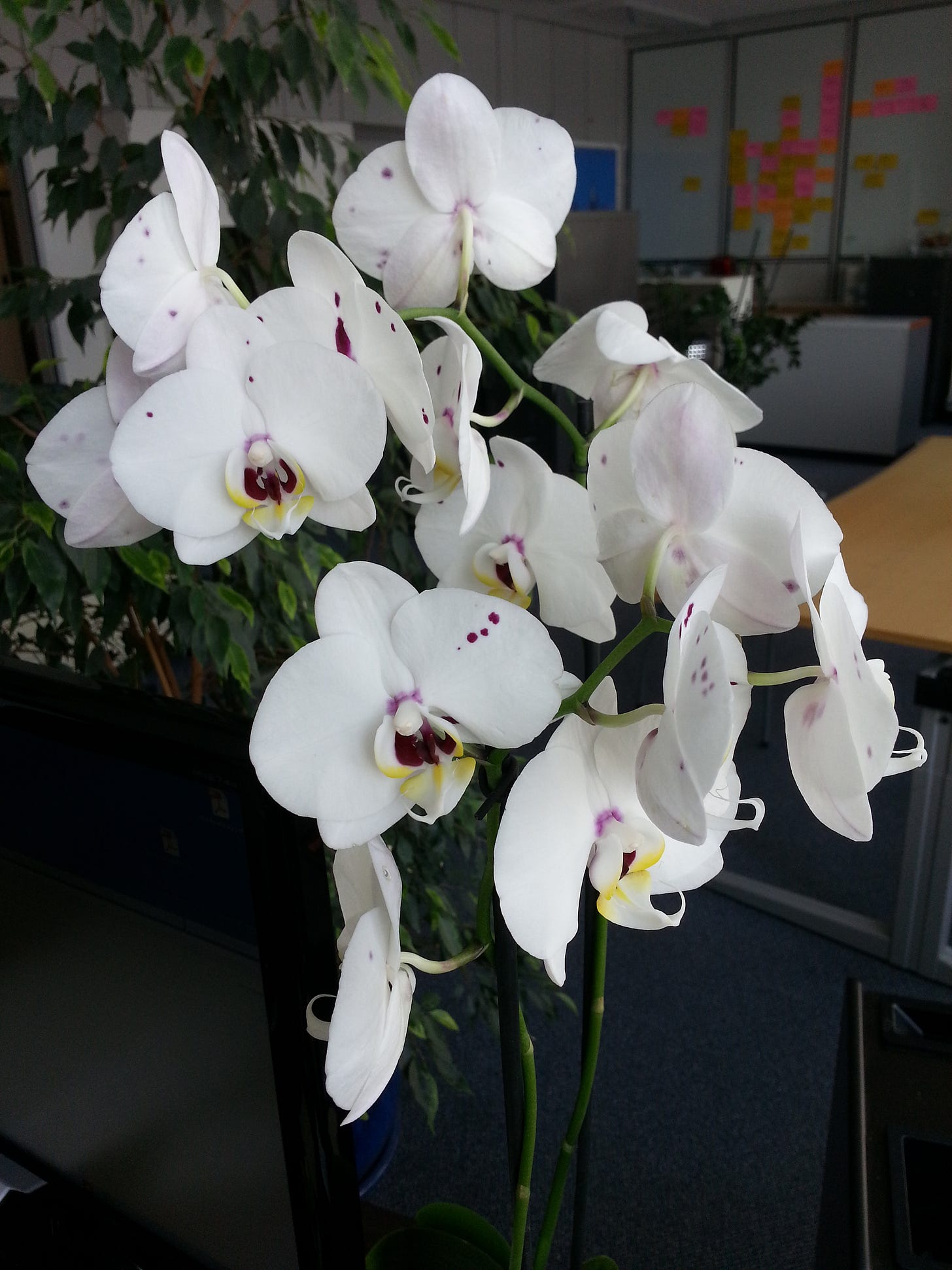 Blühende Orchidee vor Bürohintergrund