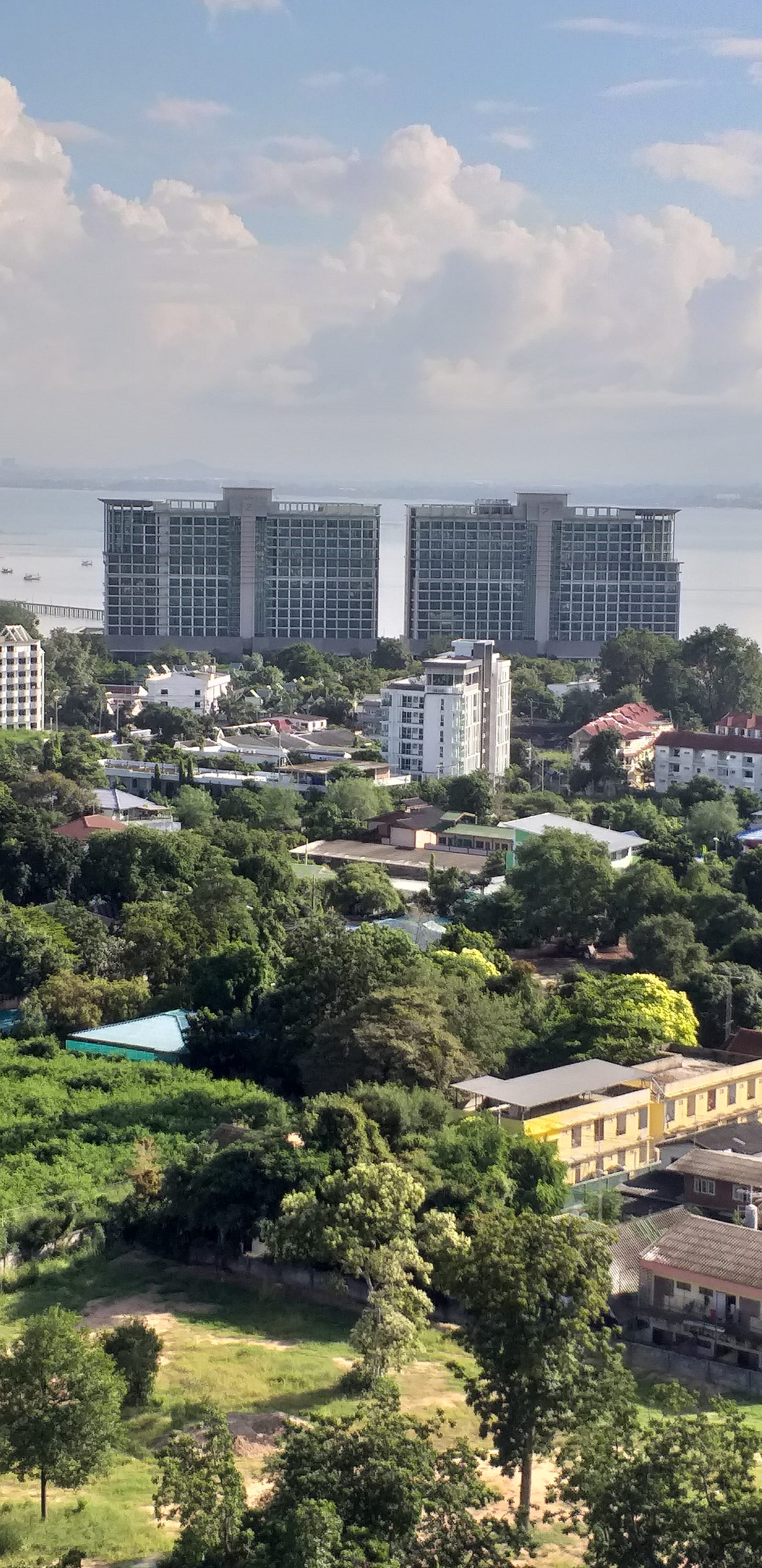 Das Bild zeigt eine weiträumige, erhöhte Aussicht auf Chonburi, unserer Stadt des Wassers.