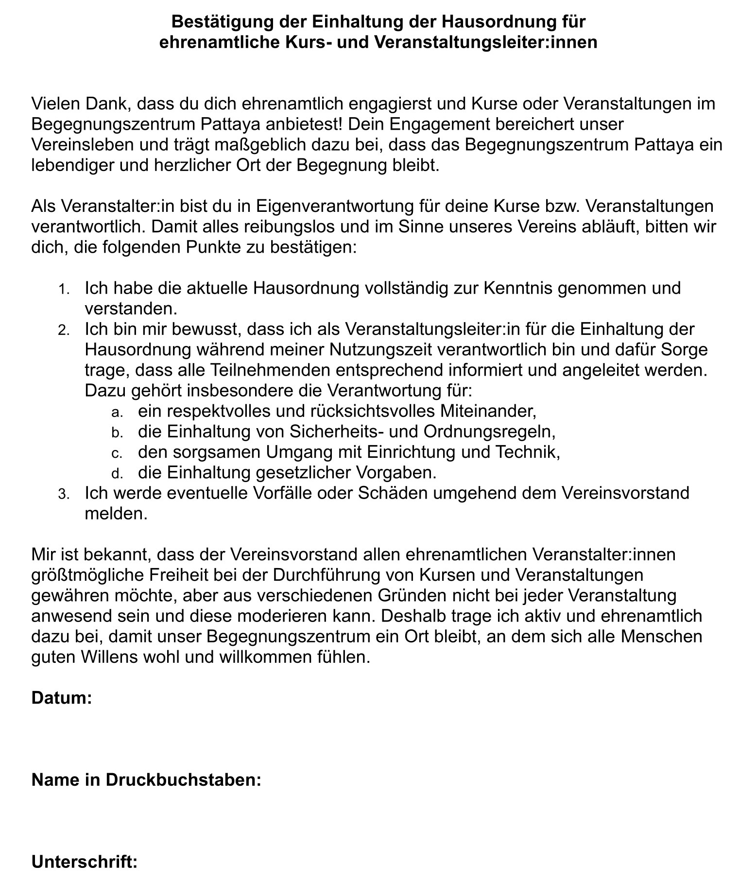Wir freuen uns sehr, dass im Alltag weitgehend Ruhe und Beständigkeit eingekehrt sind und diese von den meisten Mitgliedern, Besucher:innen und Gästen sehr geschätzt wird. In den letzten Monaten gab es allerdings zwei Situationen, in denen einzelne Personen der Meinung waren, die gemeinsam vereinbarten Regeln würden für sie nicht gelten. Wir stehen als Vorstand und Verein gerne in der Verantwortung. Wenn jedoch die gemeinsam vereinbarten Regeln (Hausordnung und Satzung) trotz vorheriger Ermahnung wiederholt nicht beachtet werden, sind wir vom Vorstand nicht mehr bereit, pauschal die Verantwortung für das (Fehl-)Verhalten Einzelner in unseren Vereinsräumlichkeiten zu übernehmen. Da der Vorstand nicht bei allen Veranstaltungen persönlich anwesend sein kann, bitten wir euch, liebe Kurs- und Veranstaltungsleiter:innen, in euren Angeboten freundlich und klar darauf zu achten, dass die Hausordnung von allen Teilnehmenden respektiert wird. Die Mitglieder des Vorstands haben die nachfolgende Bestätigung bereits als Erste unterschrieben. Wir würden uns sehr freuen, wenn auch alle übrigen Kurs- und Veranstaltungsleiter:innen dies zeitnah tun könnten. Den Vordruck dafür findet ihr im Begegnungszentrum bei Khun Jack, eine einmalige Unterschrift genügt.